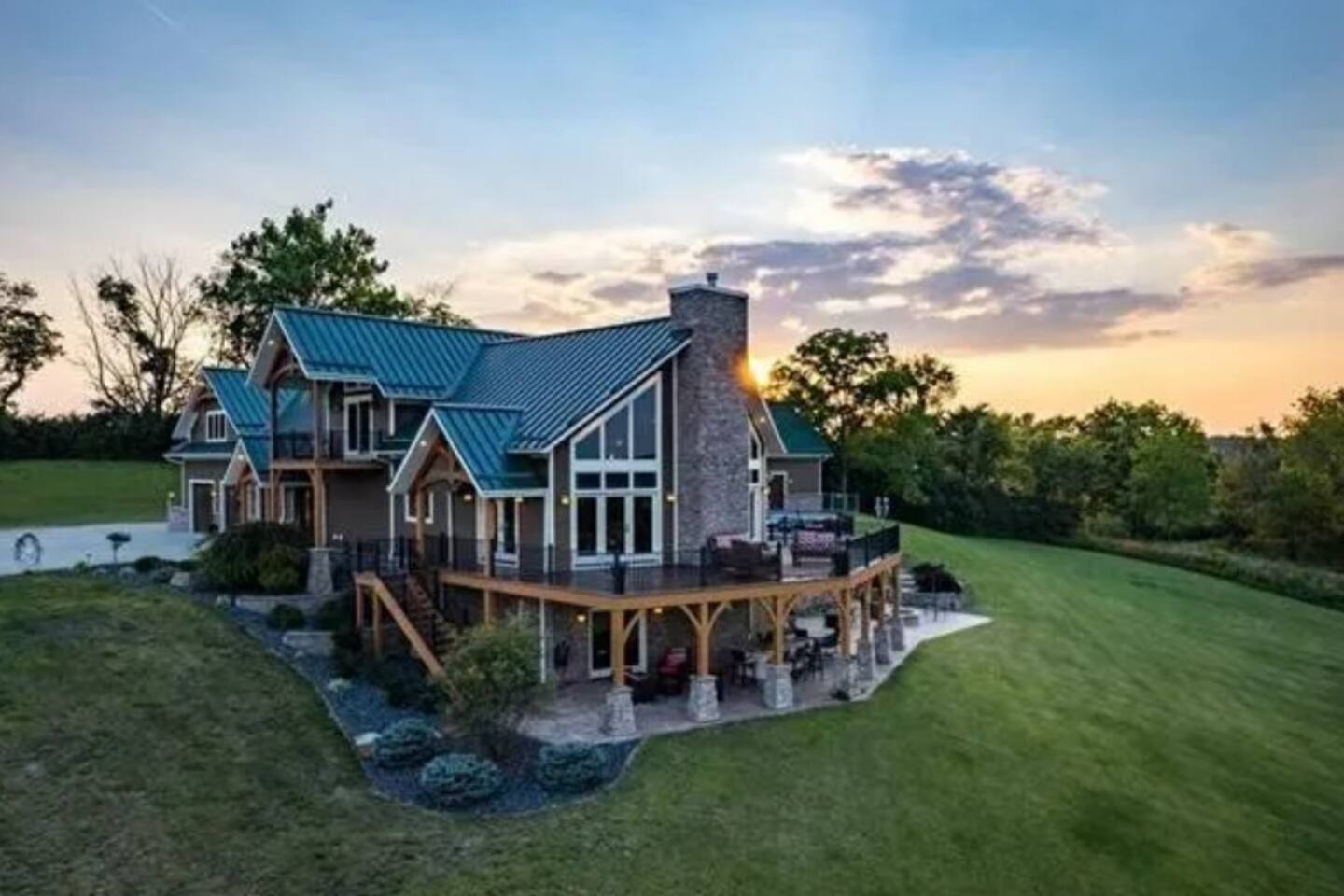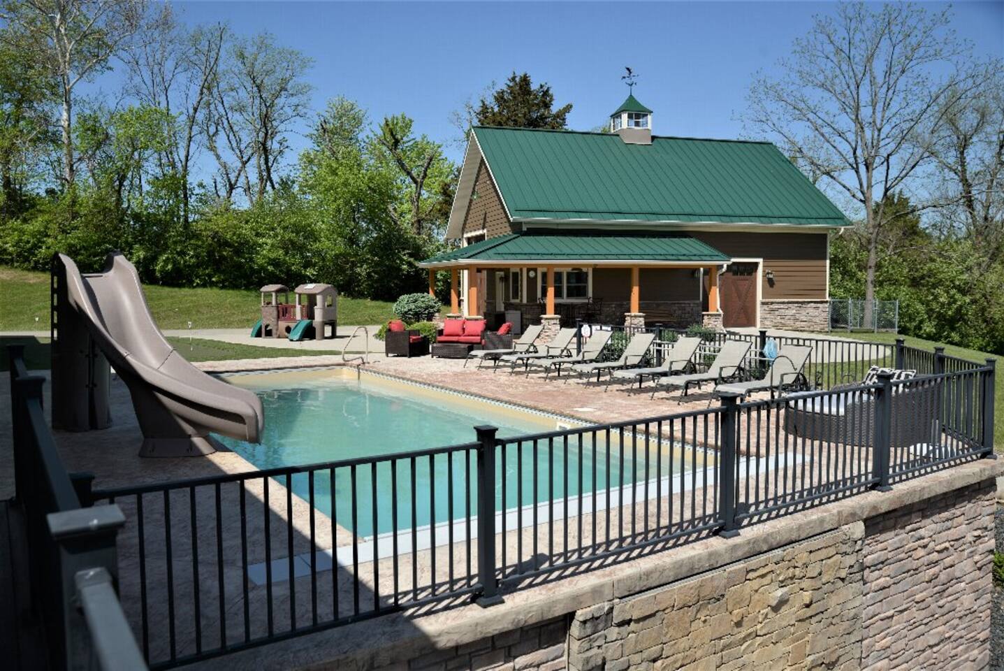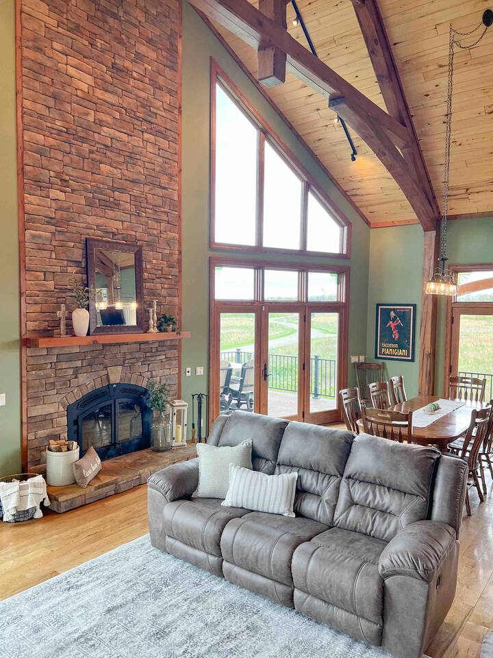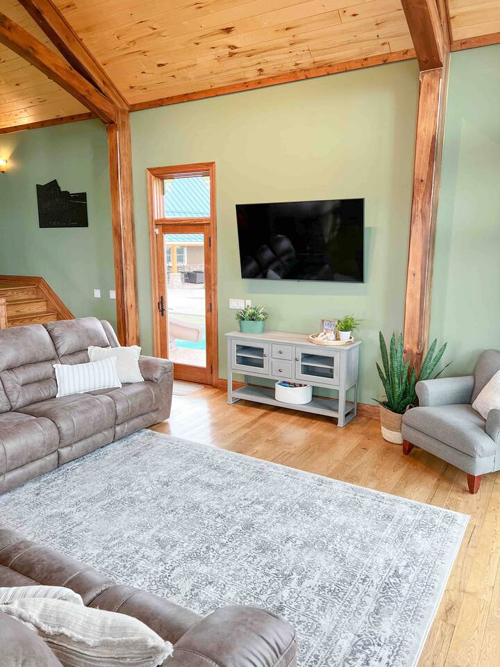 Located near Brookville Lake in Brookville, IN, this home features 5 bedrooms with arrangements for up to 20 guests, a large open floor plan, a spacious deck with picturesque views of the lake, inground heated swimming pool (mid-May through October 1, may be open earlier and/or longer depending on weather), outdoor hot tub, and nearby access to a boat ramp, to make this house ideal for a secluded getaway with a large family. The main level features a large, open living space with vaulted ceilings and a wood burning fireplace for use in the colder months. The kitchen is fully stocked and boasts a gas range, large refrigerator, dishwasher and coffee nook. A spacious island and dining room table allow for plenty of seating for large groups. This level also features a bedroom with a queen bed and a full bath. From the living room, several doors lead out to the expansive deck, with plenty of patio furniture and seating to allow for outdoor dining, while offering the most spectacular views of Brookville Lake. The private primary suite is located on the 2nd floor and features a king bed and twin bed, large closet and beautifully done bathroom with individual his/her sinks and custom tile shower. The opposite end of the house contains a separate staircase leading to three additional bedrooms, which are outlined below. Again, there is a spacious bathroom with custom tile shower, as well a cozy loft with additional couch seating and TV for relaxing in the evenings. The house also showcases a large walkout basement, which is perfect for additional entertainment. With a large leather sectional, stone fireplace, huge bar area, theater room, baseball-themed half bath and several games for the family to enjoy, the basement is the perfect space to take a break from the sun or relax in the evenings. Walk out from the basement onto the lower deck, which features a stone bar with built-in grill and plenty of additional patio seating for guests. Outdoor amenities at the property include a heated saltwater pool with slide and plenty of gathering areas. Enjoy the water or sit out at any of the loungers spaced around the pool while enjoying the views! Next to the pool is a small putting green and toddler playset to keep the kids busy! During colder months, enjoy the hot tub and the views surrounding Brookville Ridge. In the evenings, you will enjoy sitting around the fire pit in Adirondack chairs while roasting marshmallows and hotdogs.