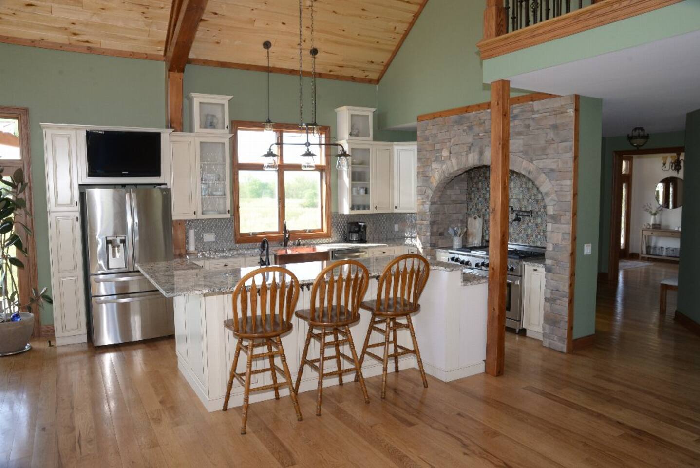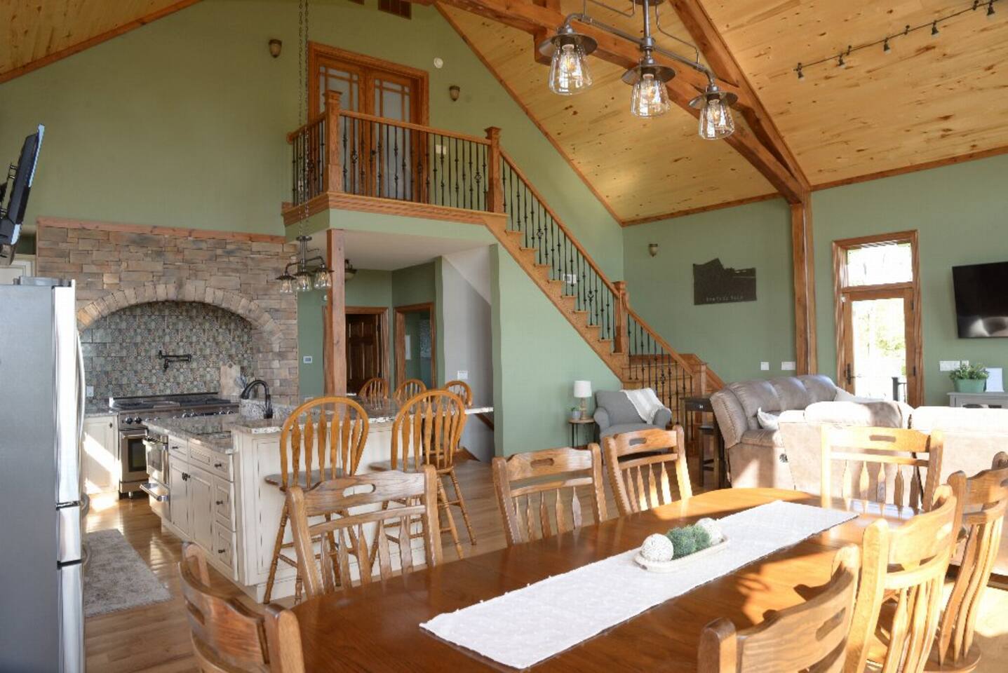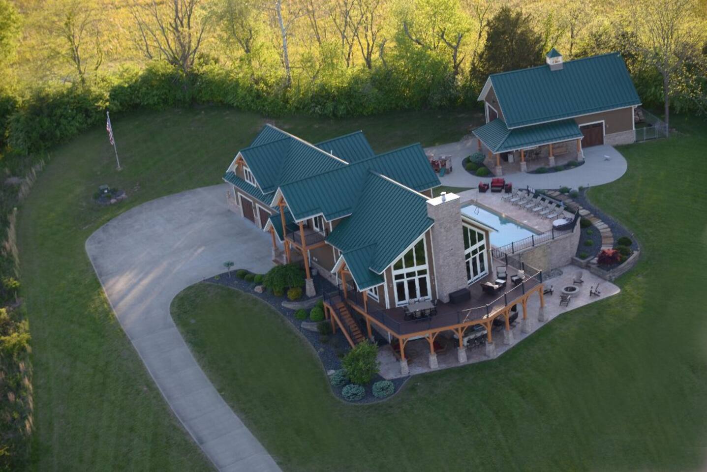 Located near Brookville Lake in Brookville, IN, this home features 5 bedrooms with arrangements for up to 20 guests, a large open floor plan, a spacious deck with picturesque views of the lake, inground heated swimming pool (mid-May through October 1, may be open earlier and/or longer depending on weather), outdoor hot tub, and nearby access to a boat ramp, to make this house ideal for a secluded getaway with a large family. The main level features a large, open living space with vaulted ceilings and a wood burning fireplace for use in the colder months. The kitchen is fully stocked and boasts a gas range, large refrigerator, dishwasher and coffee nook. A spacious island and dining room table allow for plenty of seating for large groups. This level also features a bedroom with a queen bed and a full bath. From the living room, several doors lead out to the expansive deck, with plenty of patio furniture and seating to allow for outdoor dining, while offering the most spectacular views of Brookville Lake. The private primary suite is located on the 2nd floor and features a king bed and twin bed, large closet and beautifully done bathroom with individual his/her sinks and custom tile shower. The opposite end of the house contains a separate staircase leading to three additional bedrooms, which are outlined below. Again, there is a spacious bathroom with custom tile shower, as well a cozy loft with additional couch seating and TV for relaxing in the evenings. The house also showcases a large walkout basement, which is perfect for additional entertainment. With a large leather sectional, stone fireplace, huge bar area, theater room, baseball-themed half bath and several games for the family to enjoy, the basement is the perfect space to take a break from the sun or relax in the evenings. Walk out from the basement onto the lower deck, which features a stone bar with built-in grill and plenty of additional patio seating for guests. Outdoor amenities at the property include a heated saltwater pool with slide and plenty of gathering areas. Enjoy the water or sit out at any of the loungers spaced around the pool while enjoying the views! Next to the pool is a small putting green and toddler playset to keep the kids busy! During colder months, enjoy the hot tub and the views surrounding Brookville Ridge. In the evenings, you will enjoy sitting around the fire pit in Adirondack chairs while roasting marshmallows and hotdogs.
