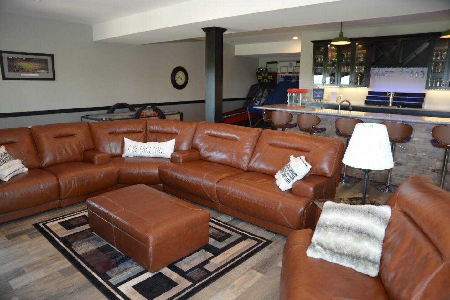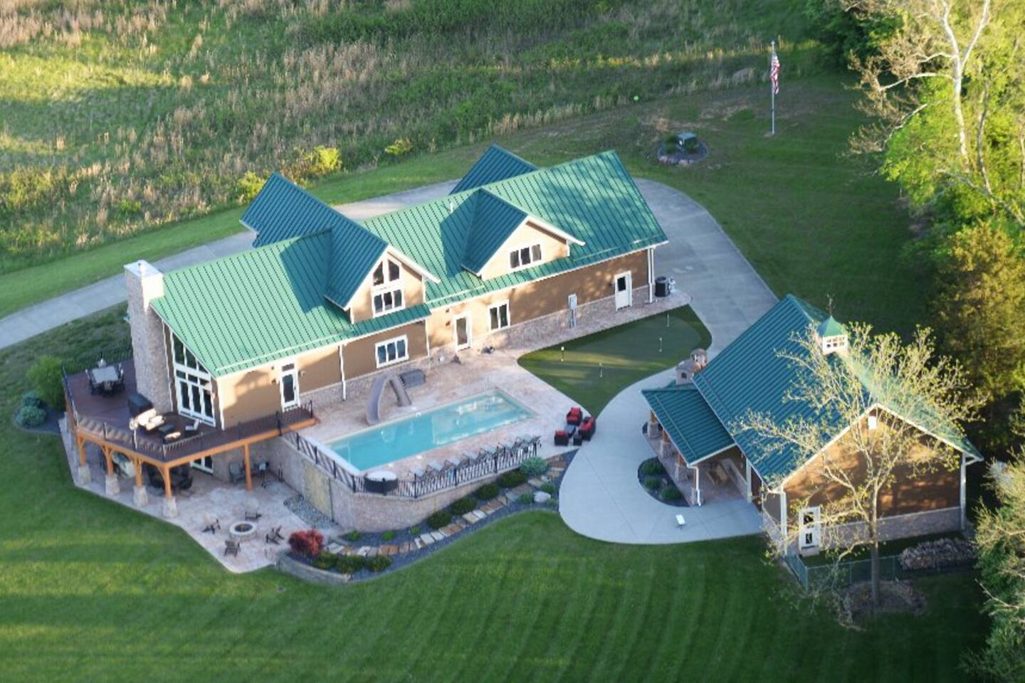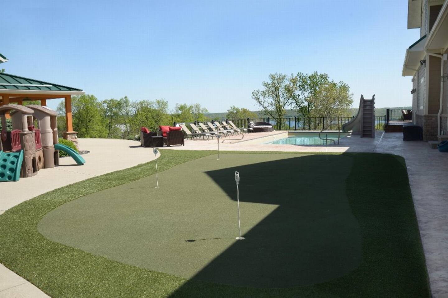 Escape to your own private oasis at this lake home! Relax in the pool, new hot tub, perfect your putt on the green by the pool, or gather in the game room for some family fun. With quick access to the lake, enjoy water activities like boating, fishing, or hiking along the trails around the lake. End your day by the fire pit, making s'mores and creating memories that will last a lifetime. There's something for everyone at this stunning lake home!
